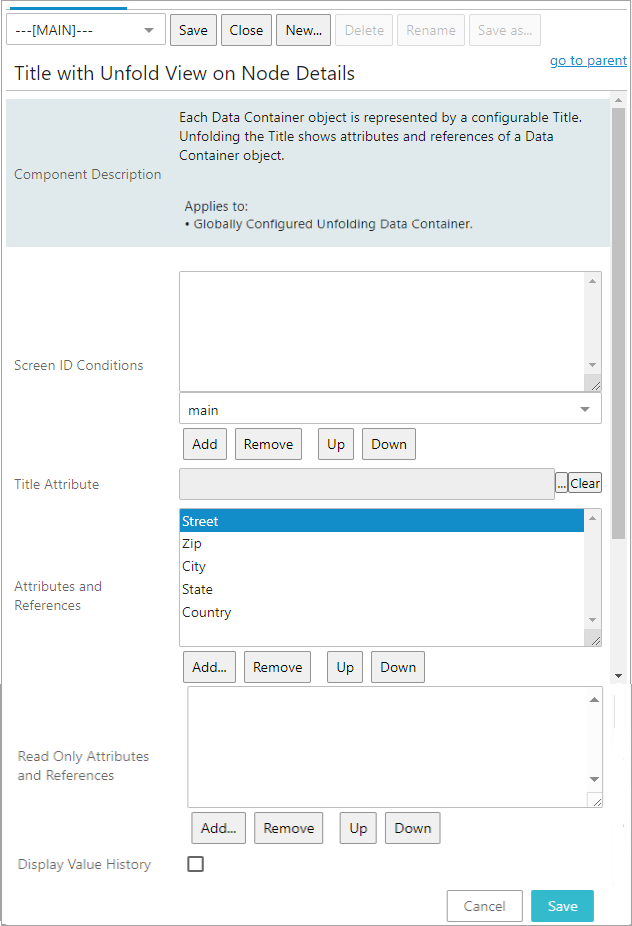 In the 'Attributes and References' parameter field, add the attributes and references to display when the data container is unfolded by clicking the Add button under the field. In the example above, five address attributes have been added to the data container.