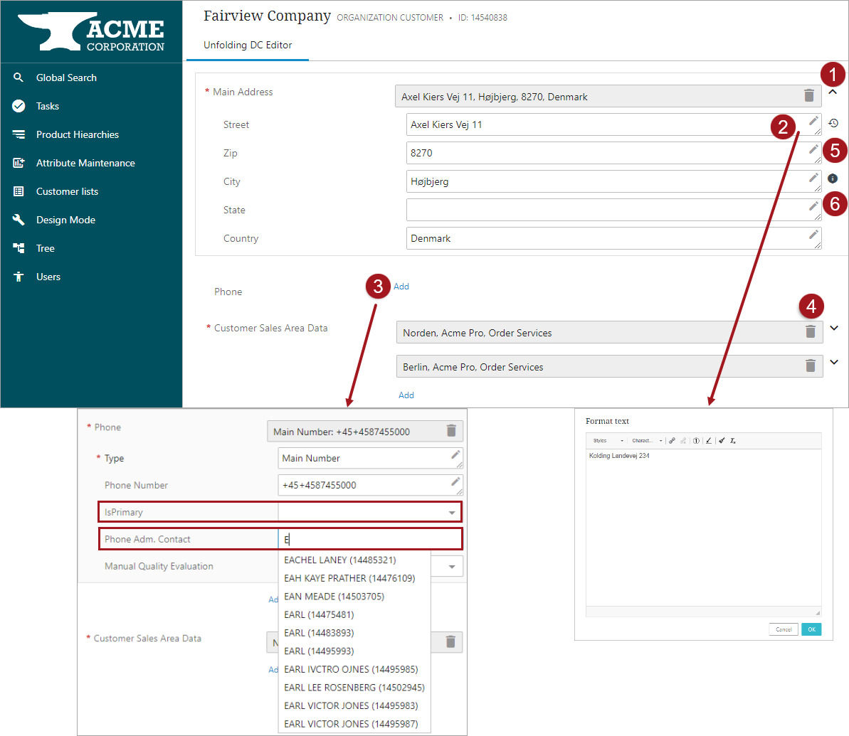 In the example below, the three data container instances ‘Main Address,’ ‘Phone,’ and ‘Customer Sales Area Data’ have been configured within the Globally Configured Unfolding Data Container and are displayed on a Node Details Screen.