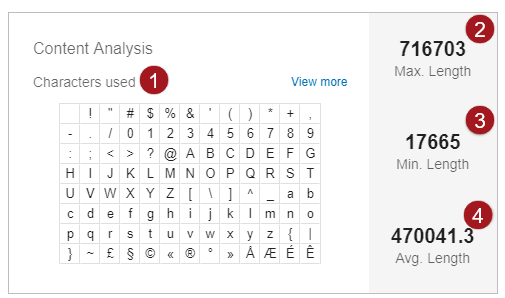 1. The Characters used table indicates which characters appear within the values of the attribute. If there are too many characters to fit into the widget, click the View more link to display all characters in a separate window.
