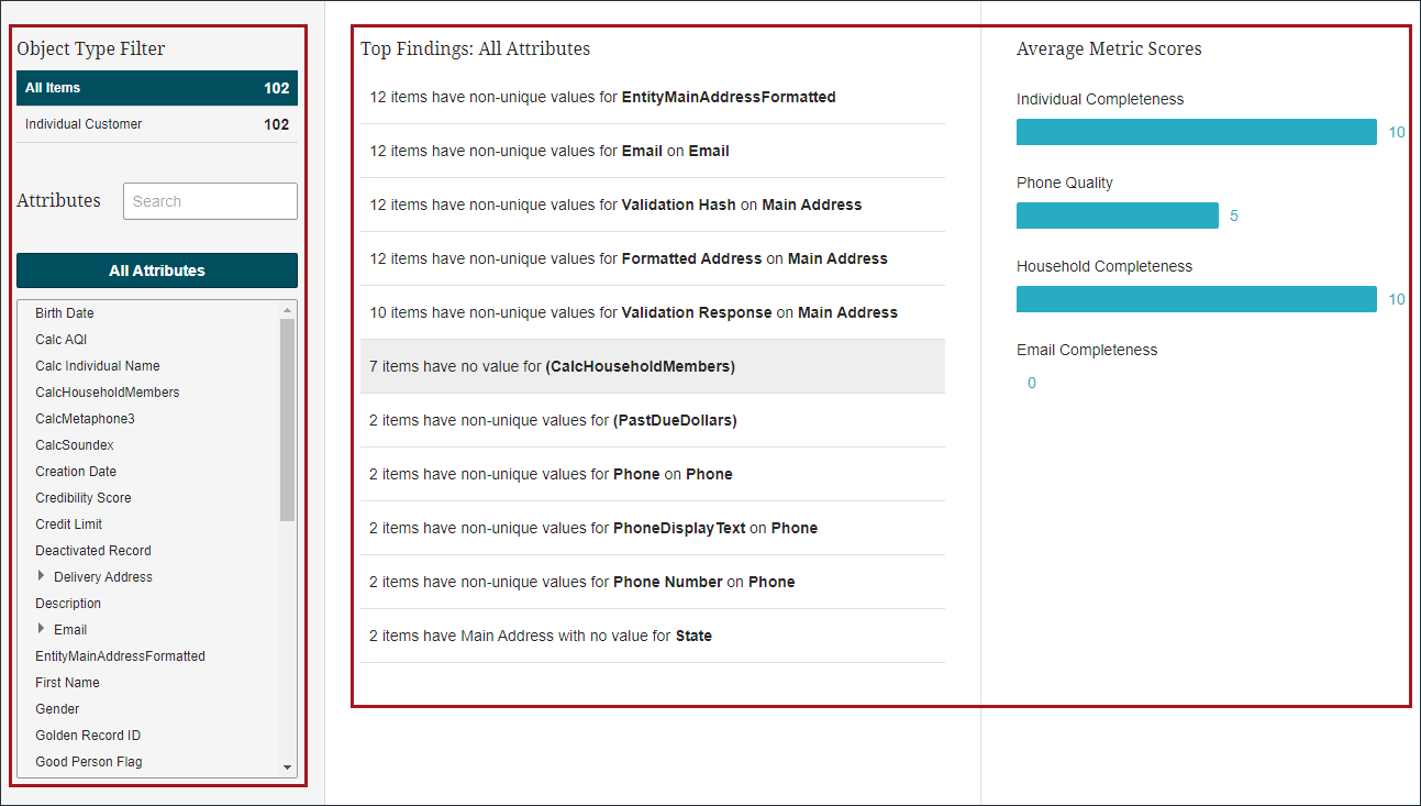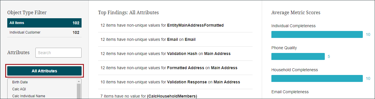 This principle also applies to other aspects of the data profile such as the Average Metric Scores and Attribute data widgets.