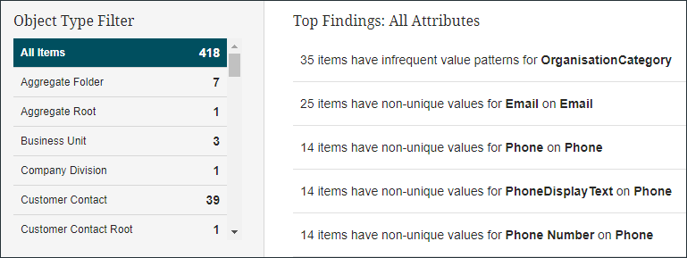 For example, in the image below 'All Items' has been selected, and no object type filter is applied. The Top Findings section in the right-hand side of the screen represents the top findings for all object types included in the profile: