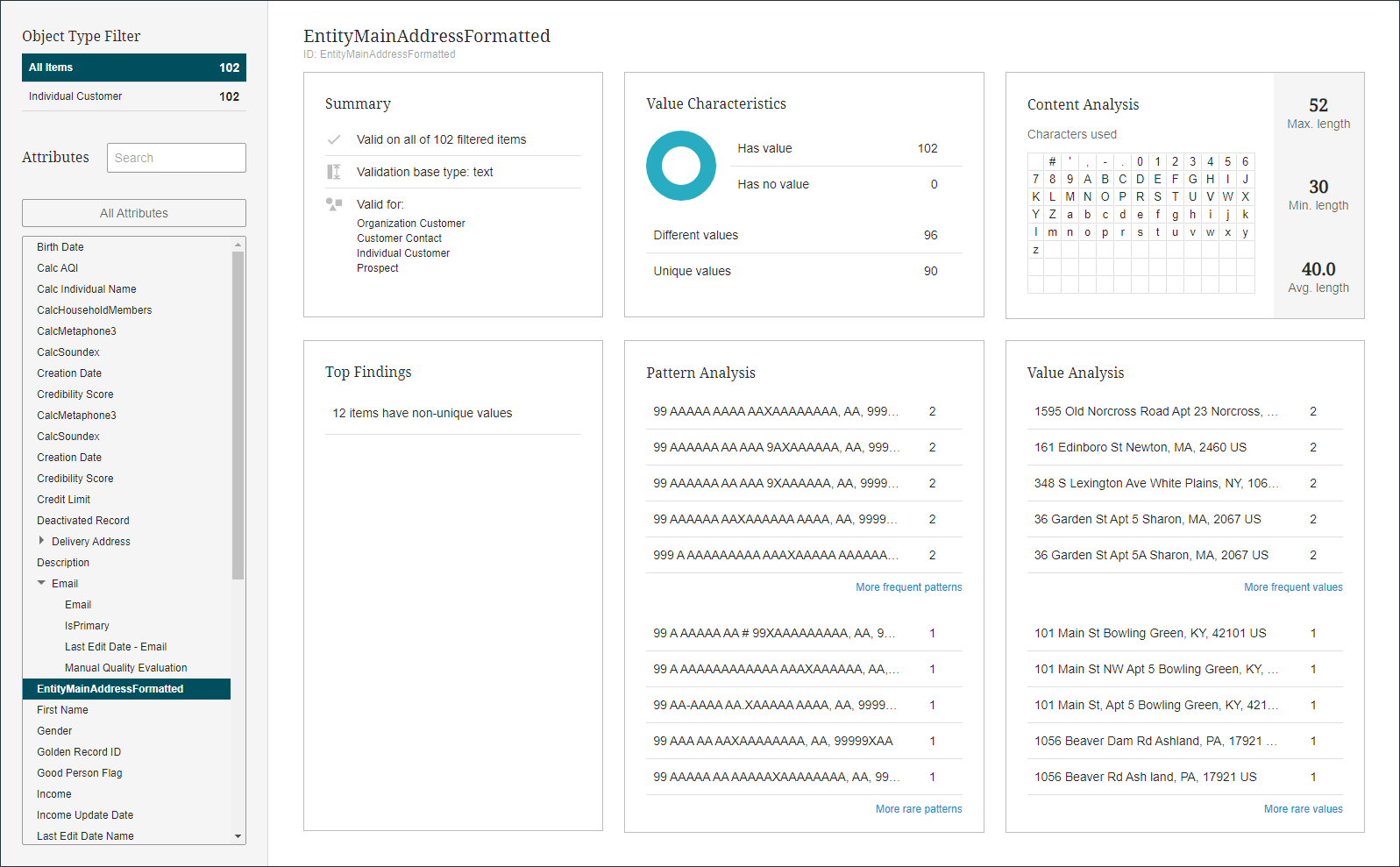 With the filter applied, the data steward can analyze the attribute data via the accompanying Attribute data widgets. Additionally, the Top Findings widget will now only display findings relevant to the attribute in question.