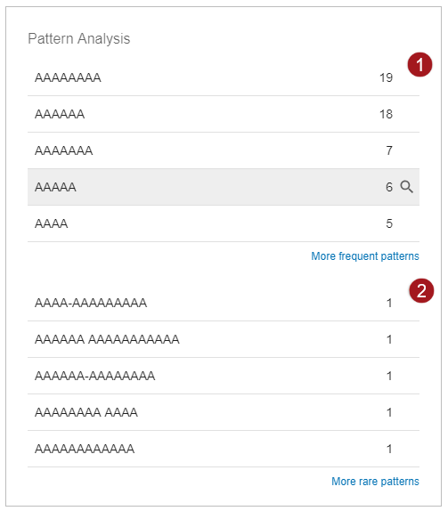 2. The Rare Patterns list (appearing at the bottom of the widget) provides a list of the rarest value patterns in descending order. If there are too many patterns to fit into the widget, click the More rare patterns link to display all value patterns in a separate window.