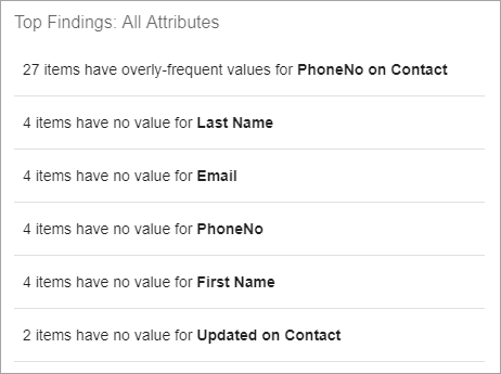 The Top Findings widget provides users with a list of outliers found in the data. These outliers may indicate issues with the data, but are not conclusive and require analysis by a data steward.