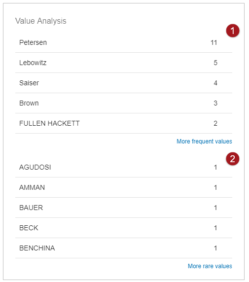 The Value Analysis widget provides a breakdown of an attribute's most frequent values and rarest values within the context of the profile:
