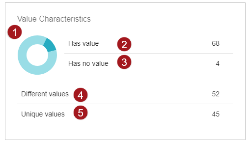 The Value Characteristics widget provides a breakdown of an attribute's values by how many objects have values for said attribute, and how many different and unique values exist, all within the context of the profile: