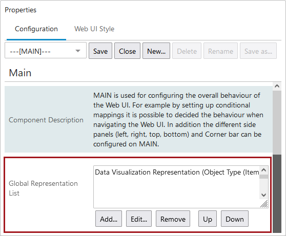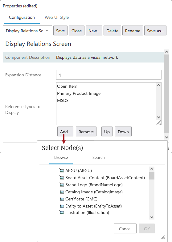 Within the Main Properties, which are used for configuring the overall behavior of the Web UI, configuration can be done to set up the look of the graphical interface that users will view when using any Display Relations screen. Object type and reference styling only needs to be set up one time, and the selections will be applied to usage throughout a specific Web UI, regardless of how many Display Relations screens are used.