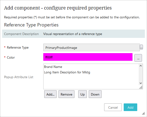 ) to the right of the field to select a color. If you choose to enter the hex color code yourself, the format is a six-digit hex color code. The '#' sign that is usually associated with hex color coding is applied automatically. Use this color coding to visually distinguish between different types of data. - If desired, enter the metadata attributes that you want to display when you hover over the Reference Type. These are the metadata attributes that are on the object to the target.