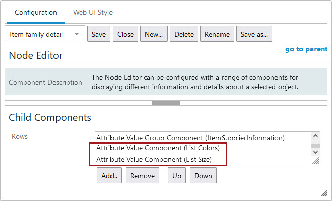 In this example, an Attribute Value Component has been added for 'List Colors', the 'Defining' attribute, and one for 'List_Size', the 'Dependent' attribute.