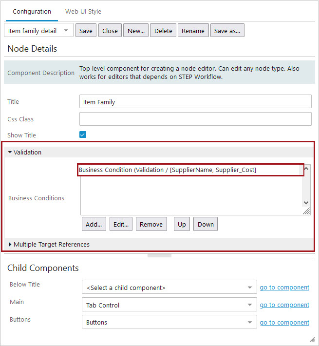 Select the desired screen from the dropdown, and expand the Validation section to display the Business Conditions parameter. Click the Add or Edit button to open the Business Conditions Properties dialog.