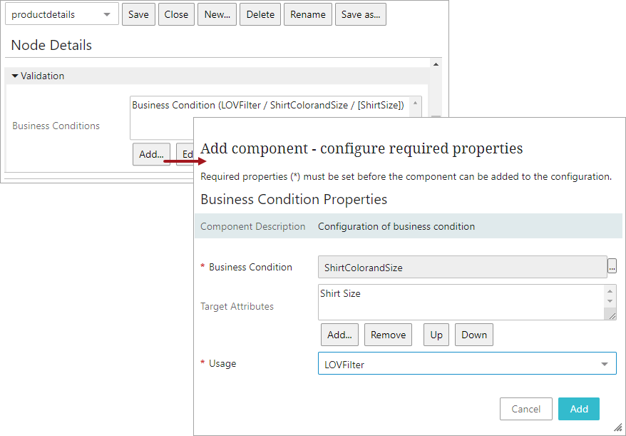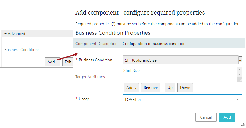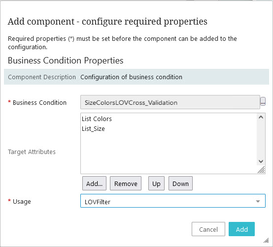 Double-click the added business condition. In the 'Add component - configure required properties' dialog that displays, under the 'Target Attributes' parameter, click the 'Add...' button. In the Node Picker that displays, find and select the two attributes—the 'Defining' and 'Dependent' attributes—referenced in the business condition.