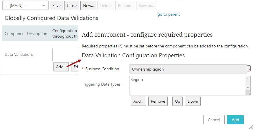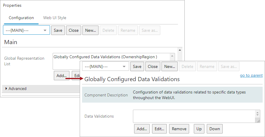 From the screen dropdown, select the MAIN option, and scroll to the Global Representation List parameter. Click the Add or Edit button to open the Globally Configured Data Validations dialog.