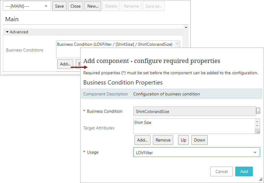 From the screen dropdown, select the MAIN option, and expand the Advanced section to display the Business Conditions parameter. Click the Add or Edit button to open the Business Conditions Properties dialog.