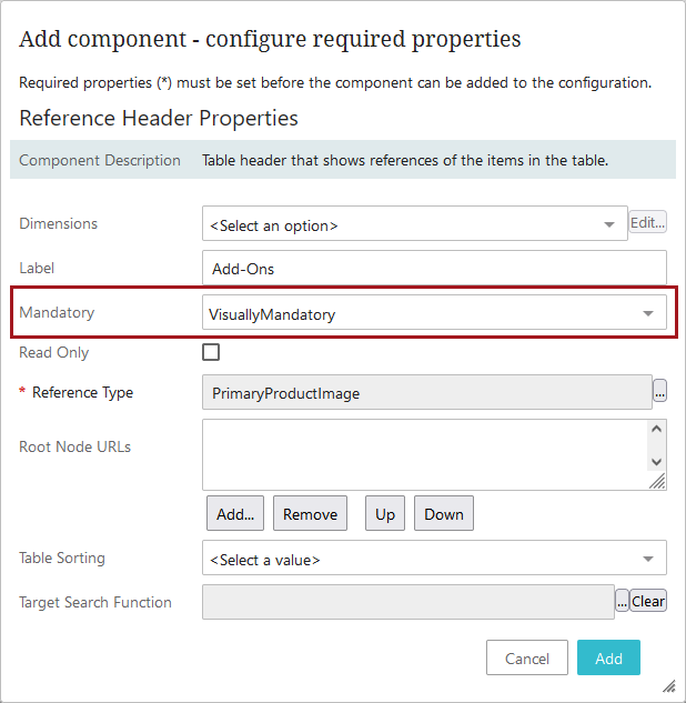 To configure headers in a tabular view to display as mandatory, set the Mandatory parameter on the header component to 'VisuallyMandatory.'