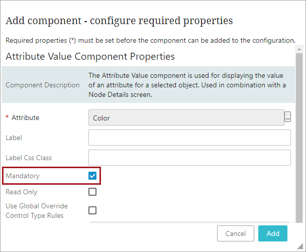 To configure attributes to be mandatory, check the Mandatory parameter in any Attribute Value or Attribute Value Group component.