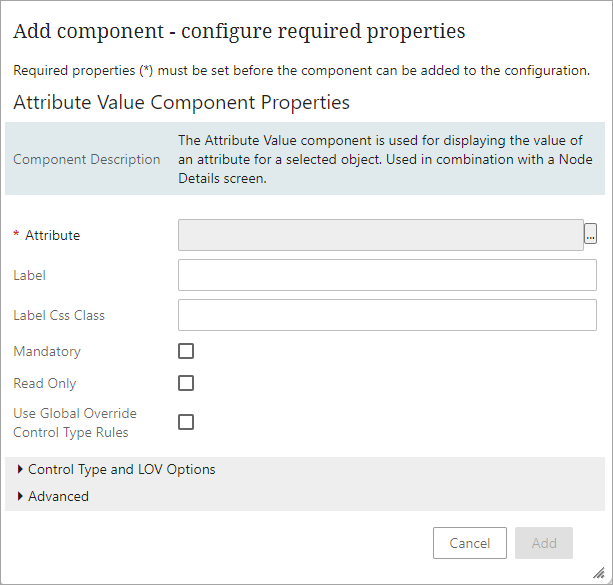 A new window called 'Attribute Value Component Properties' (shown below) displays. Using the Node Picker, select the source attribute whose value will determine whether additional attributes (to be configured later in this topic), will display or remain hidden.