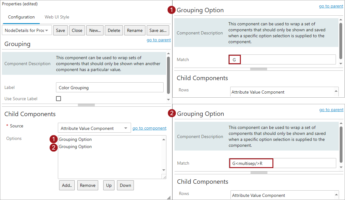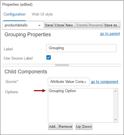 Now the Grouping Option component can be configured to define the source attribute value that, if entered, will prompt display of contingent attributes.