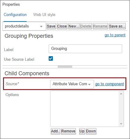 The Attribute Value Component Properties window will close, and the Grouping Properties designer window will display with the 'Source' parameter populated with the 'Attribute Value Component' selected. Admin users returning to the Grouping component to edit the source attribute can access the 'Attribute Value Component Properties' again by clicking the 'go to component' button to the right of the 'Source' field, as shown below.