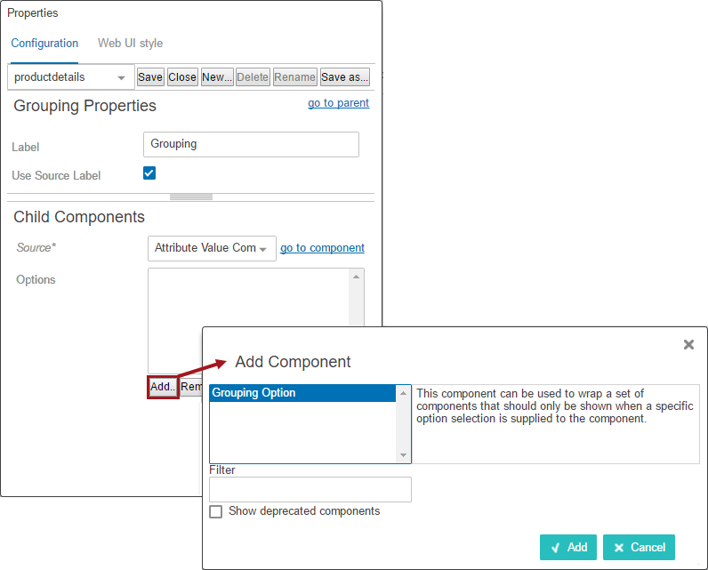 In the Child Components section on the 'Grouping Option Properties,' in the 'Rows' field where the Attribute Value or Attribute Group Components have been configured, add a new 'Grouping Option' component.