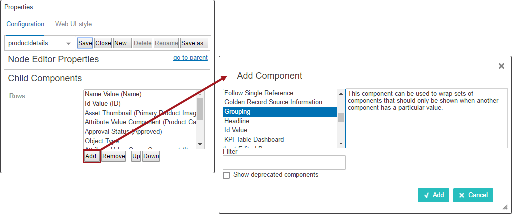 Important: To avoid issues related to display in the Node Editor, be sure that the source attribute and contingent attributes are valid for the object type being viewed and have been instantiated on the relevant product hierarchy. If this is not done, the Grouping component will not work as expected.
