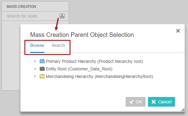 1. A selection must be made for the Tab Pages parameter. Two valid options work with the Mass Creation functionality: Browse and Search. After adding a Browse tab, double-click the Browse title in the parameter field to set, if needed, any Tree navigation limitations for end users. If adding a Search Table tab, there is additional configuration to be done to the Search Table Tab Properties to maximize the search feature.