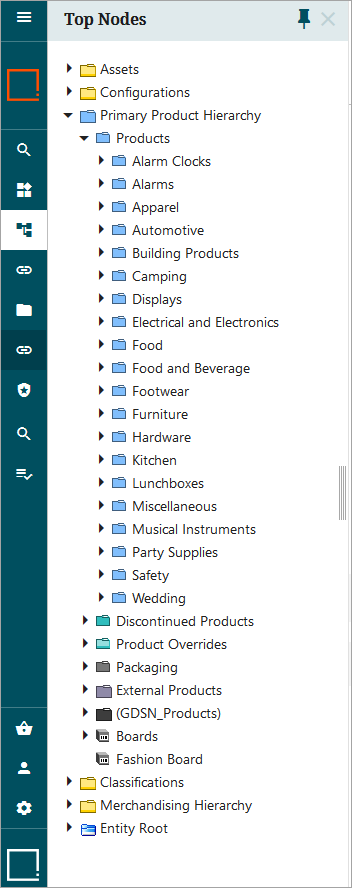 Search - When clicked, enables standard global search functionality directly from the Global Navigation Panel. Users may configure the following search plug-ins for this button: Below Search, Golden Record - Source Record ID, Name or ID or Attributes, or Object Type Search. The button label and the icon can be customized.