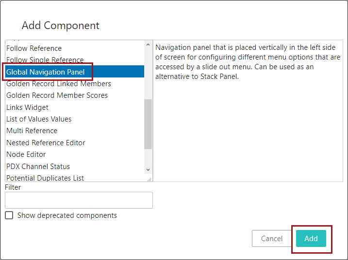 - In the 'Add Component' dialog, select 'Global Navigation Panel,' and click 'Add.'