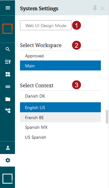 ) When clicked, the System Settings button displays a full column containing features related to accessing the designer, selecting the workspace, and selecting the context.