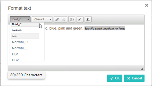 The 'Format text' dialog options, and their descriptions, are listed below. These text formatting options are important since they will apply, if applicable, when fed into other systems (for example, when used as website text or within printed publications).
