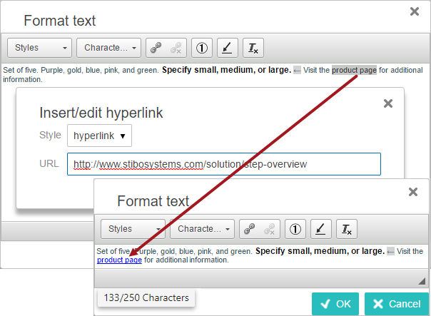 Important: After all changes have been made within the text editor, you must click OK to save all of the changes. Clicking 'Cancel' or navigating away from the page means that the changes made in the RTE will not be saved or displayed.