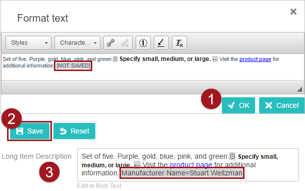 - Once you click OK, the 'Format text' editor will show the inline reference as '[NOT SAVED].' You will need to click OK on the text editor and then save the data before it will display in the value field. The attribute must be valid for the object type, otherwise the inline reference disappears from the value field upon save.