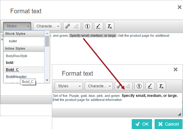 The headings below correspond with the hover text that displays when you mouse over each of the format dropdowns or icons at the top of the 'Format text' dialog.
