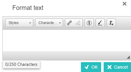 To insert a character tag, place your cursor within the text exactly where you want the character tag to display. Then, click the Character tag dropdown and make a selection. Character tags appear with a gray background within the 'Format text' dialog and within the attribute value field.