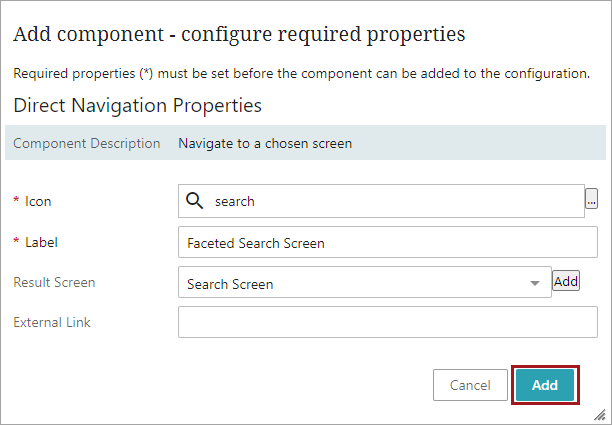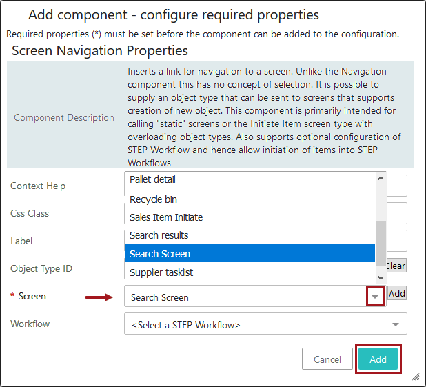 On the Screen Navigation configuration screen (shown in the image below), in the Screen parameter, select the Search Screen created earlier in this process. Make edits to the additional parameters as desired. Click the Add button.