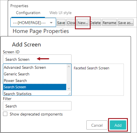 In the Designer, create a new screen by selecting New. In the 'Add Screen' dialog, type 'Search' in the Filter parameter to limit the list displayed. In the Screen ID parameter create a name, select the Search Screen option, and click the Add button. In the example below, the Screen ID is named 'Search Screen' and will be selected later.