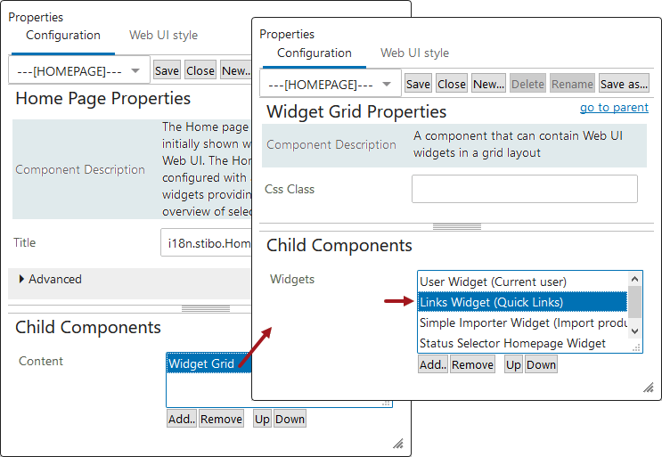 Navigate to the Home Page configuration screen, in the Child Components section, add a Widget Grid or double-click the Widget Grid that is displayed. For more information, refer to the Adding Widgets to a Homepage topic.