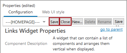 On the Widget Grid configuration screen, in the Child Components section Widgets field, add a Links Widget or double-click the Links Widget that is displayed. For more information, refer to the Homepage Widgets topic.