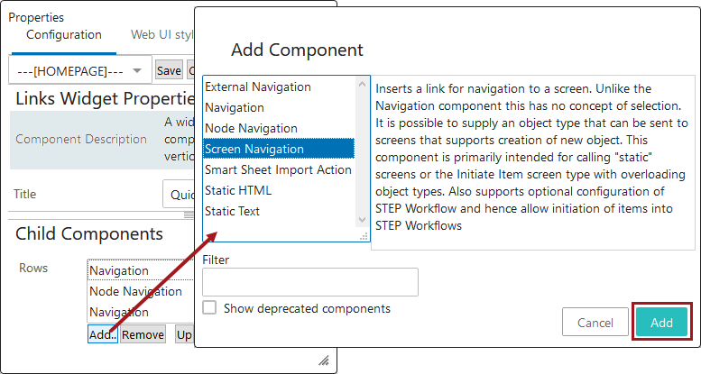 On the Links Widget configuration screen, in the Child Components section Rows field, click the Add button to display the Add Component dialog. Select the 'Screen Navigation' component and click the Add button.