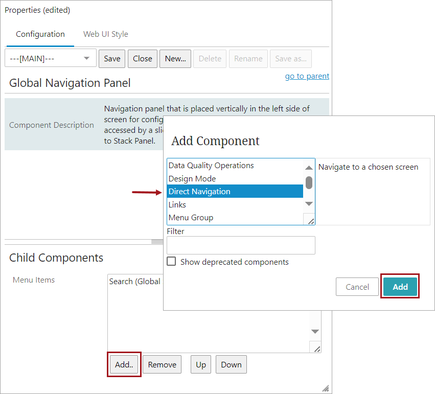 On the Global Navigation Panel configuration screen, in the Child Components Menu Items field click the Add button to display the Add Component dialog. Select the Direct Navigation component and click the Add button.