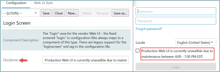 In addition, you can use the 'Disclaimer' field in the Login Screen to add a message for users to indicate that maintenance is currently occurring.