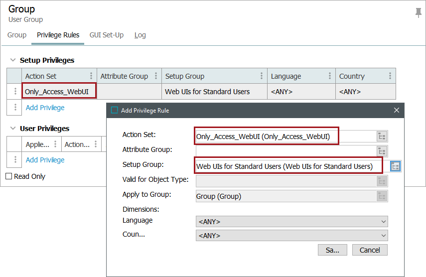 For the 'Setup Group' field, find and select the setup group (created in step 1) that contains the Web UIs this group of non-admin users should access. The 'Add Privilege Rule' dialog should resemble the one pictured in the screenshot below.