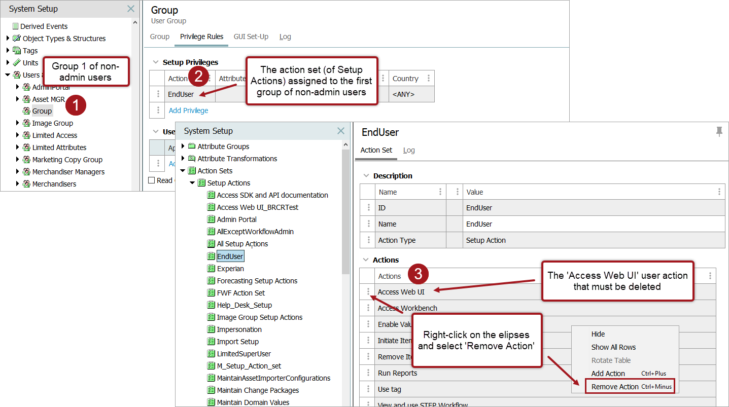 Important: If restricting user access to specific Web UIs, ensure there are no competing Action Sets set for the user group. The action set with the most generous access applies, not the Action Set with the most restrictive access.