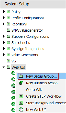 To create a new Web UI setup group, in the workbench, right-click on the 'Web UIs' node in the 'System Setup' tab and select 'New Setup Group' from the menu that displays.