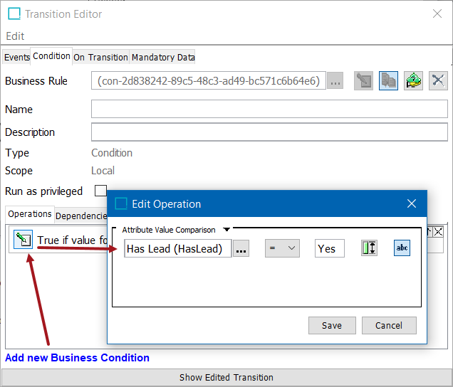 In order to determine where the task should go, an attribute with ID=HasLead is evaluated. If the value is Yes, the task must go to the Has Lead state. If the value is No, the task must take the other transition. We could set up a "Yes" condition and a "No" condition, applying one to each transition out of the state as appropriate, and that would accomplish the end result. However, if an object did not have the HasLead attribute populated, it would not have a viable transition, unless we wrote a condition to account for a null value. Assuming mandatory attribute functionality was applied and we could ensure a value was present, there is however still an easier way to do it using only a single condition, which evaluates to true if HasLead=Yes. By leaving another transition with no conditions applied, and instructing the system to always evaluate the conditioned transition first, all tasks with the Yes value are caught first and appropriately routed, and all tasks with a 'No' or null value take the other (unimpeded) option.