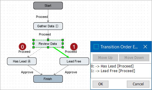 1. In the dialog that appears, select any entry and use the Move Up or Move Down buttons to set the appropriate order. This example uses only two transitions, but this method works for any number of transitions. The '0' transition is evaluated first, and subsequent transitions are evaluated in sequential order. The system will send the object via the first transition it finds that evaluates as true.