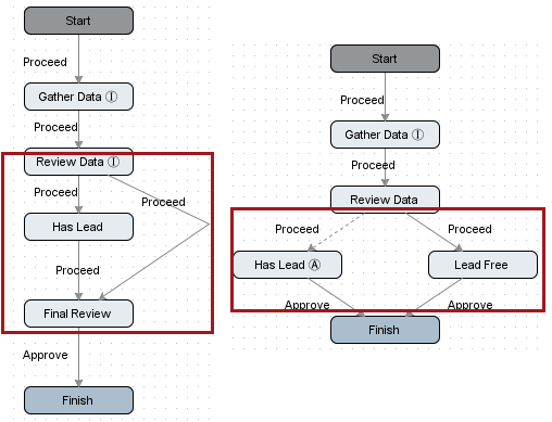 This setup can be used to skip states, as well as to select between one of two states. Therefore, either of the below workflows could utilize it, and in both cases the outcome will be that the task is sent to the Has Lead state from the Review Data state, if needed. In all cases, all transitions out of the Review Data state have the Proceed event. With this setup, the end user will view only a single selection option (Proceed) when submitting the task, allowing the system to make the decision, while keeping things simple for the end user.