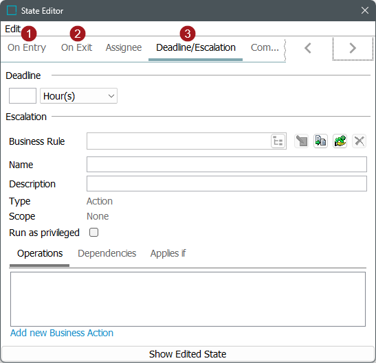 It is important to note the order of operation of the various rule types (condition or action) and where they are applied (entry, exit, transition, or deadline).