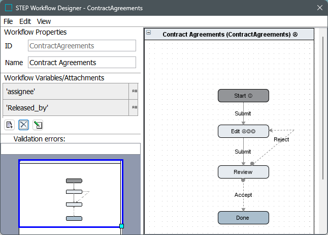 Below is a simple example of how a number of business rules can work together to make a coherent and functioning workflow. You can define business actions to be executed as part of the workflow on states or transitions, and to define conditions to be tested before transitions between states are performed.