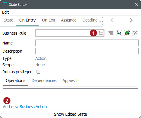 Click the Add new Business Action / Add new Business Condition link (2) to create a local business action