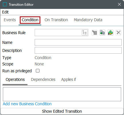 Note: If more than one condition is present, they are evaluated in order. Multiple conditions could be present at exit from a single state using multiple events on a single transition, or by having multiple transitions exiting the same state. If a condition evaluates to false, additional conditions are evaluated (if present). The first event with a condition that returns true is the event / transition that is taken. If a condition returns false (and no subsequent transitions evaluate to true), the transaction is stopped and the task does not exit the state.